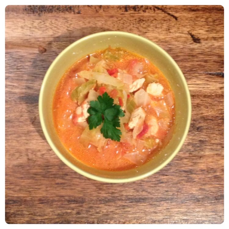 - Add stock, coconut milk, chilli, cabbage, tomatoes and tomato paste. Simmer 25 minutes.