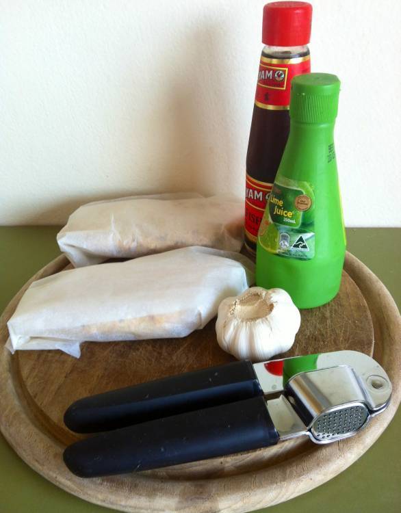 • Combine kecap manis, sesame oil, honey, garlic and lime juice in a small bowl